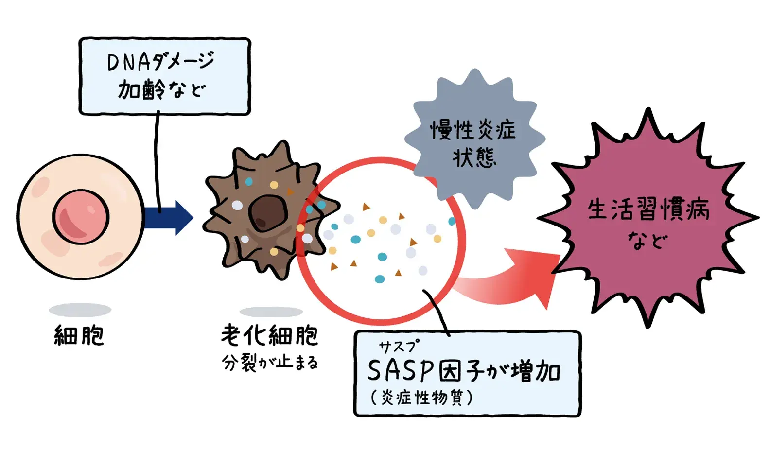 老化細胞とは、細胞の機能が衰え老化し、先ほどお話ししたような炎症因子を出してしまう古い細胞のことです。この炎症因子は、総称してSASP因子と呼ばれます。SASPとは「Senescence-Associated Secretory Phenotype」の略で、日本語では「細胞老化随伴分泌現象」と訳されます。